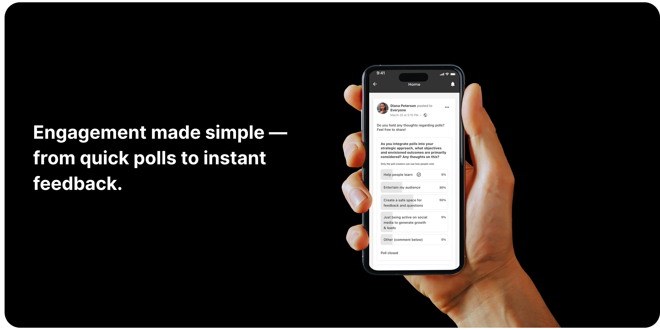 We designed a Polls post-type feature—a clear, intuitive way for group members to ask and answer questions. The design balanced functionality with simplicity: