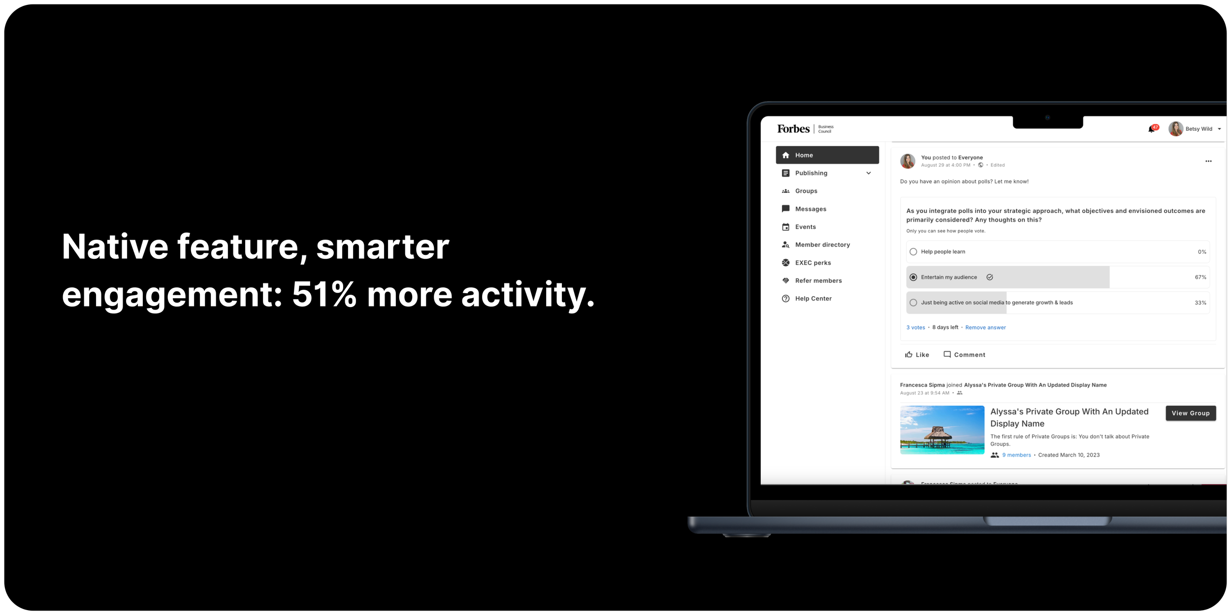 Community.co, a white-label platform powering executive communities for brands like Forbes, Rolling Stone, and Fast Company, needed a new way to drive engagement across its communities. Members were asking for a simple way to spark conversations and gather input.