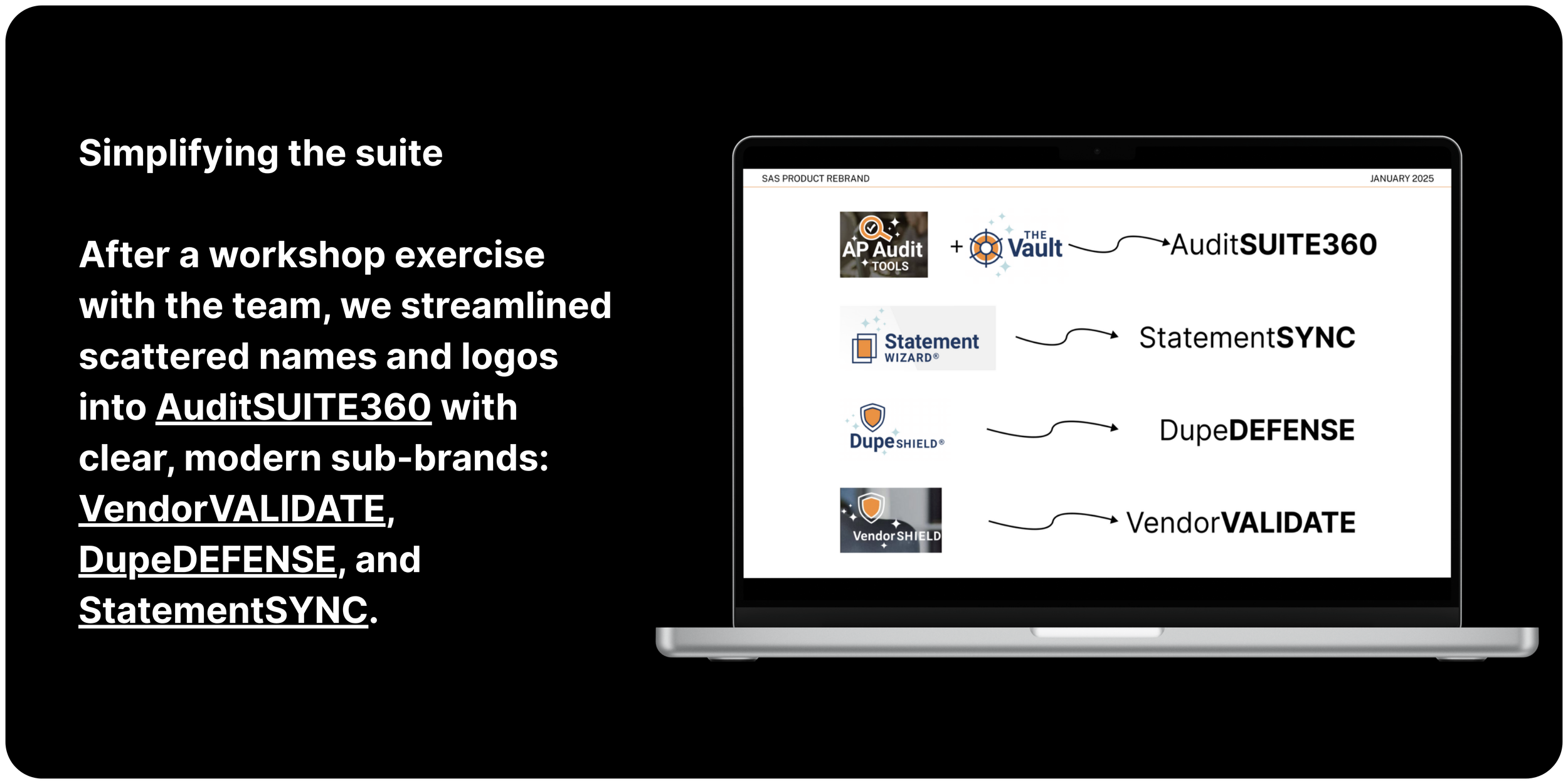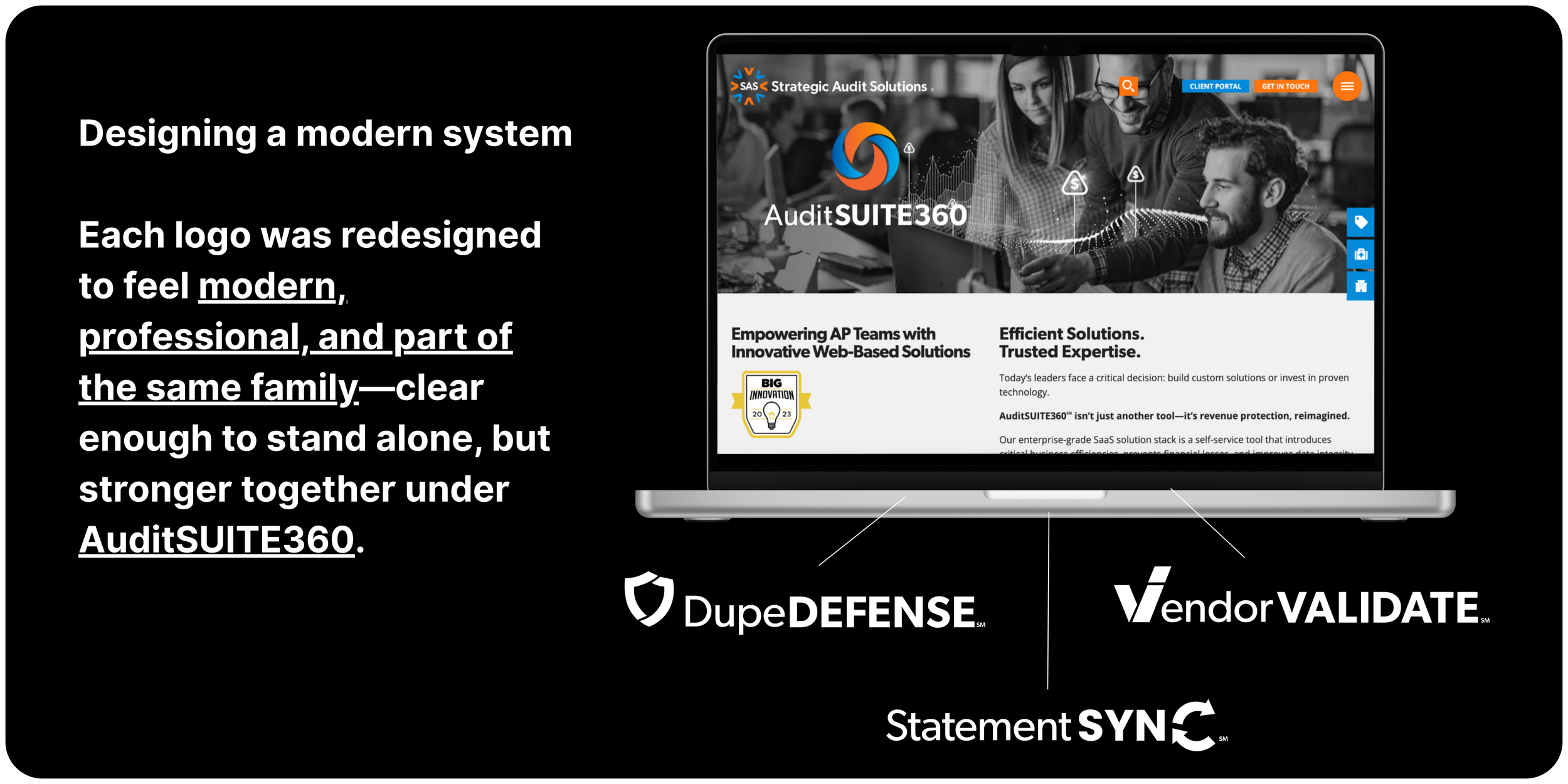 SAS had the tools—trusted for financial recovery and risk prevention—but their brand no longer matched the strength of their products or the direction of the company. Together, we transformed SAS into AuditSUITE360: a unified, modern suite designed to reflect their innovation, professionalism, and role as a forward-looking technology partner.